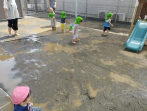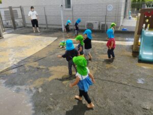 色々な方向を飛ぶ水を全身で浴びに行くお友だち、少し離れた場所で様子見をするお友だちがいました☺