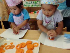 可愛いエプロンをつけたらよーく調理の先生のお話を聞いてニンジンの型抜きに挑戦しました💪✨