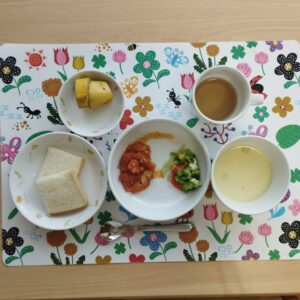 今日の給食🍞スティック食パン・イタリアンチキン・パプリカとブロッコリーのチーズサラダ・ミルクスープ(玉ねぎ、かぼちゃ)でした😁