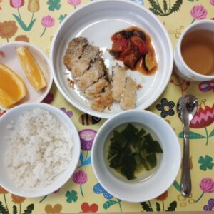 ごはん・さわらのカツレツ風・夏野菜のラタトゥイユ・コンソメスープ(小松菜、えのき)・オレンジ