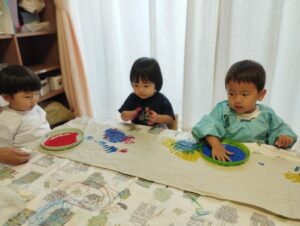 紙に豪快に絵の具をつけて楽しむ子が多かったです😆🌈