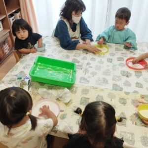 片栗粉遊びでは片栗粉に水を加えたものをみんなで触ってみたりスプーンで混ぜたりして遊びました💫