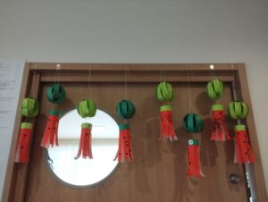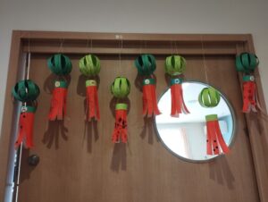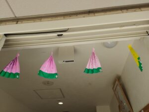 スイカの飾りを作り、飾ると嬉しそうに「これ作ったの」「私の!」「僕の!」と自分のマークが見えると教えてくれます🍉