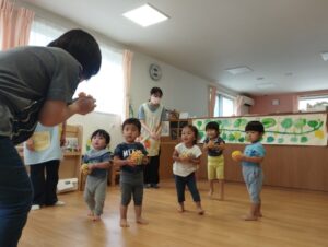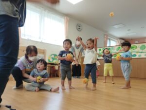 ピアノのリズムに合わせてスポンジボールを投げたりしました❢