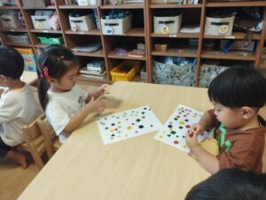 今日も室内遊びで、過ごしました😆タンバリン組さんは、シール貼りを上手にしていて、み~んなとても集中していましたよ🤭