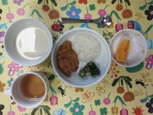 今日の給食🍚夏野菜のチーズドライカレー・オクラのおかか合え・コーンスープ・オレンジでした❣