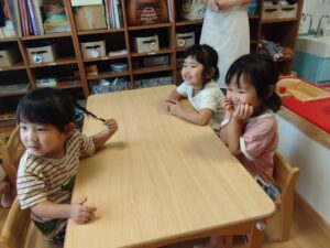 朝の会では水鉄砲の歌をみんなで歌い、水遊びへの期待が大きく膨らんでいました🎈