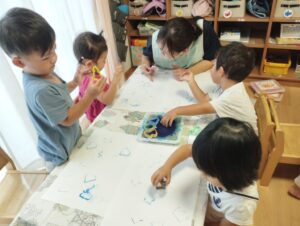 「ハートだ!」と、どの形かお友だちと言いながらインクをつけてスタンプしました!