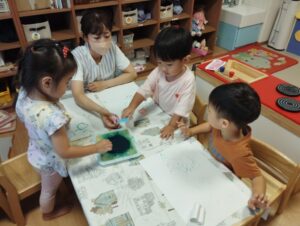 「やさいのおなか」の絵本を読んでから始め、「これは人参。」「オクラ。」とお野菜のお名前を言ってスタンプしていました🥕