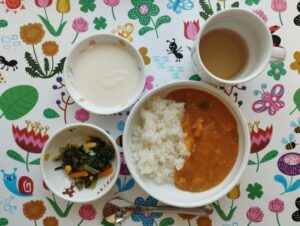今日の給食🍚サーモンカレー・小松菜とわかめのサラダ・ヨーグルトでした