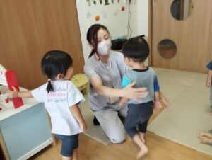 英語の最後にはみんな講師の先生にタッチやハグをしてもらいにいきます(*´ω`*)
