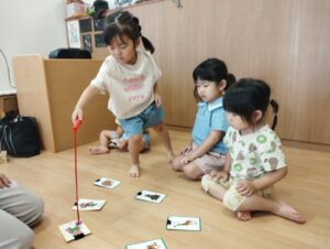 カスタネット、スズ組さんはカードにたくさん並ぶ犬にタッチ
