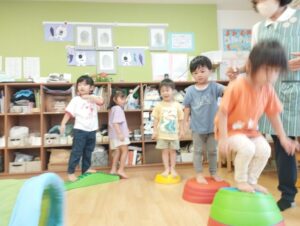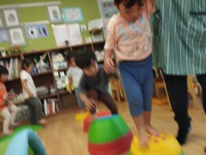 丸い形の段差は、先生と手を繋ぎながら進みます!