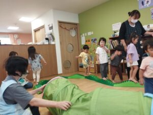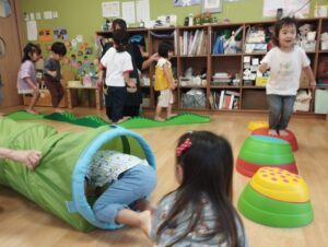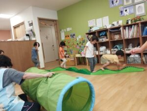お部屋で製作をしたり、トンネル、平均台で遊びました。