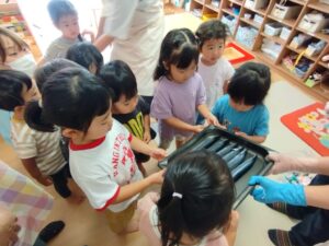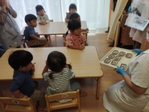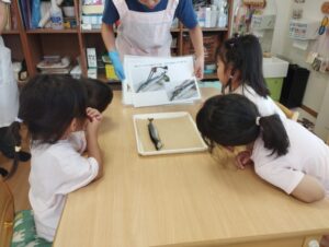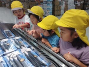 園に帰ってきてから、各クラスに買ってきた秋刀魚を見せに行きました。