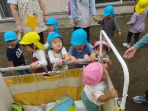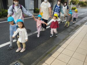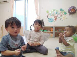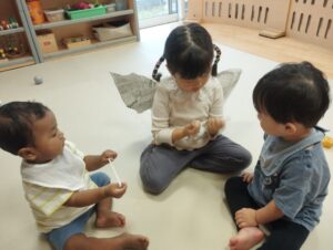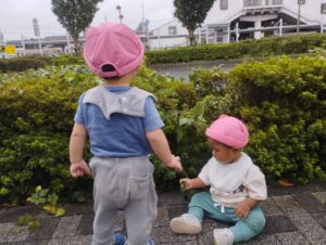 園庭に出てカスタネット組さんの新しいお友だちに会い、お名前を呼んで挨拶をしています💕