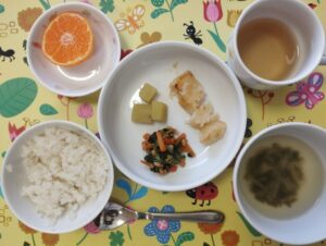 ごはん、カレイのみそ照り焼き、小松菜の納豆和え、さつまいもの甘煮、中華スープ(もやし、わかめ)、みかん