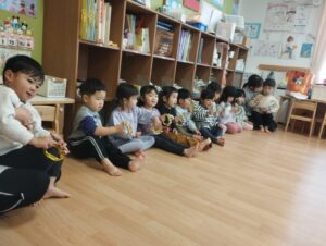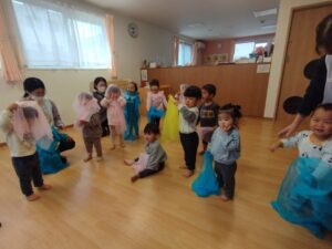 いろいろな楽器に触れたり、布を使って、布の動きに合わせて体を動かしたりして、楽しく参加しました🎶 (早)