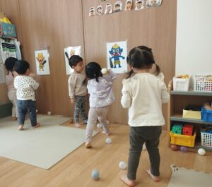 最初「こわい〜」といっていた子どもも、お友達が豆を投げるのを見て元気よく投げます!