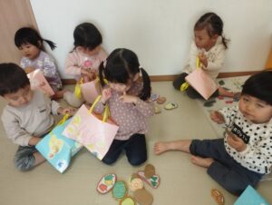 買った物をみんなで見せ合いして、「〇〇と〇〇交換しよう〜」と声をかけたり「おいしいね!」と、食べる真似をしていました✨