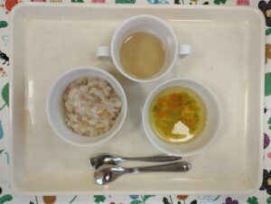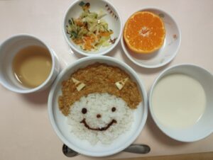 今日の給食🍚大豆入りドライカレー・キャベツのマリネ・コーンスープ・みかんでした😋