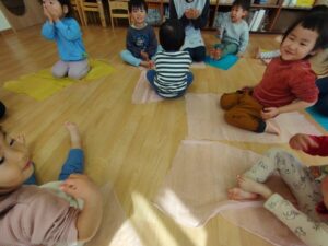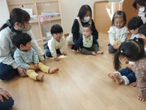 丸く座り、スポンジボールを隣のお友だちに渡していきます。
