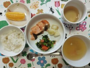 ごはん・鮭の塩焼き・小松菜の納豆和え・こふき芋・豚汁・オレンジ