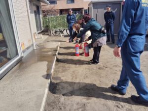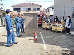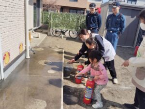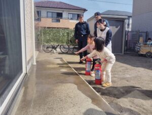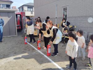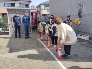 先生たちは消防士さんと消火訓練を、