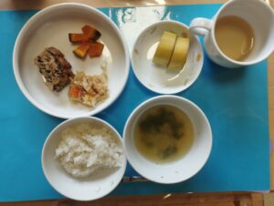 ごはん、ひじき入り鶏のつくね風焼き、切り干し大根の煮物、ゆでかぼちゃ、みそ汁(小松菜、えのき)、バナナ