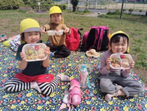 おや🤗こちらはタンバリン組のお友達園庭でお弁当食べたんだね~😋美味しかったかな~お家に帰ってからパパとママ聞いて見て下さいね😁