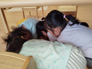 ピアノ組さんは、机の下に隠れるのバッチリでしたよ✨️