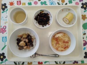 鶏肉とナスの甘酢丼・ひじきの煮物・中華スープ(豆腐、トマト、卵)・バナナ