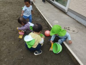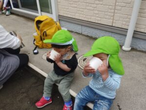 午前おやつが終わった後は、園周辺にお散歩に行きました👣沢山歩いたので、喉渇きました〜😁コップ上手でしょう〜😁この1ヶ月でとても上手になりました〜😁✌️