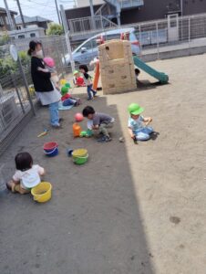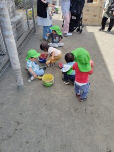皆で砂遊び!😊スコップを持って砂をすくってバケツに入れて楽しみます🤗砂遊びが大好きです✨