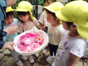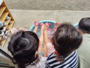 園に戻って、いただいたお花で、とっても贅沢な足湯をしました!