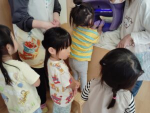 手洗いの大切さを教えていただいたあとに、魔法のジェルを付けて実践しました!