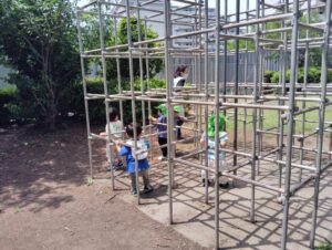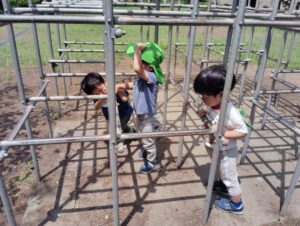 木や石、花に触れたり、ジャングルジムの中に入って先生と「ばぁ!!!」と、おどかしあったりして遊びました☺