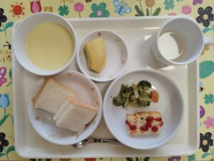 食パン・野菜オムレツ・ブロッコリーのごま和え・ミルクスープ(かぼちゃ、たまねぎ)・バナナ