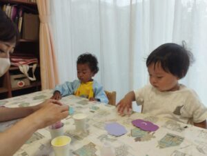 お散歩の後、スズ組さんは今月の製作をしました♡紫陽花をイメージして、乳酸菌飲料の容器で模様付けしましたよ😌