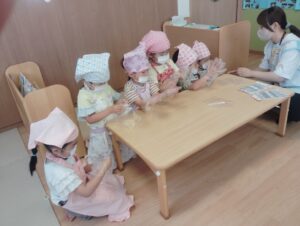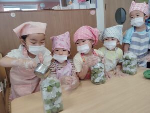 みんなが応援してくれている中で、ピアノ組さんが3本の梅シロップを作りました。