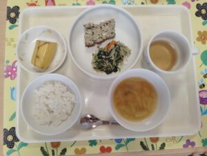 ごはん、松風焼き、ほうれん草のナムル、みそ汁(かぼちゃ、たまねぎ)、バナナ