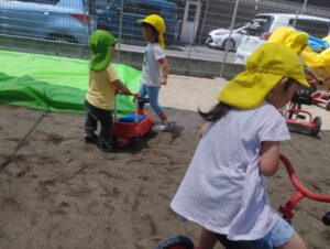 公園から帰って来て園庭にコンビカーがあるの