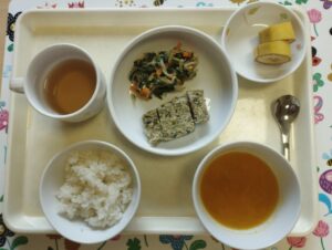 ごはん・松風焼き・ほうれん草ナムル・みそ汁(かぼちゃ,たまねぎ)でした✨