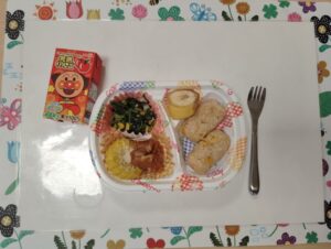 コーンご飯、鶏肉のオーブンからあげ、ほうれん草とベーコンのソテー、ゆでとうもろこし、バナナ