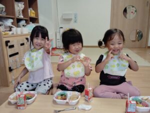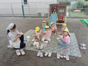 お外で食べるのもテーブルをくっつけてみんなで囲むのもいつもと違った雰囲気で楽しいですよね。(山)