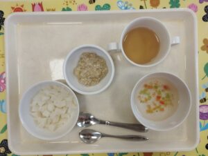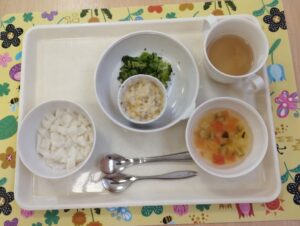 今日の給食🍙パン粥・ポテトグラタン・ゆでブロッコリー・コンソメスープ(トマト,ズッキーニ)バナナ