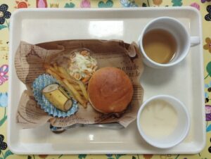 ハンバーガー・コールスローサラダ・ポテト・コーンスープ・バナナ