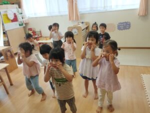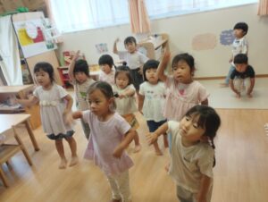 タンバリン組さんとピアノ組さんは水遊びの前に「私の可愛いところ」と「すみっこ音頭」を一緒に踊りました🎶