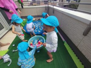 水が顔にかかると驚いて泣いてしまう子もいましが、すぐに切り替えて水をかけ返して楽しんでいました😁