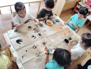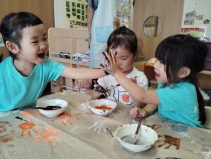 手形をおばけに見立ててみたり、お友達とハイタッチをして色の混ざり合いを楽しむ姿がありました!
